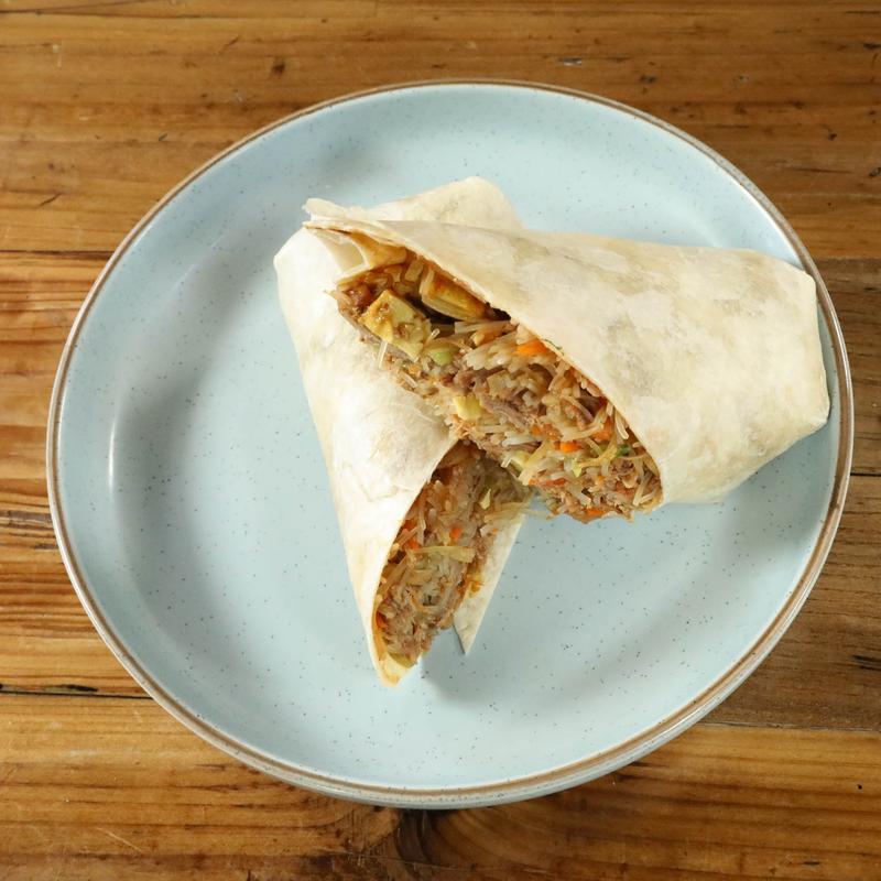 Adobo braised pork, pancit noodles and vegetables, baked egg tamago, pork cracklins, serrano pepper with manila midnight sauce and calamansi juice wrapped in flour tortilla